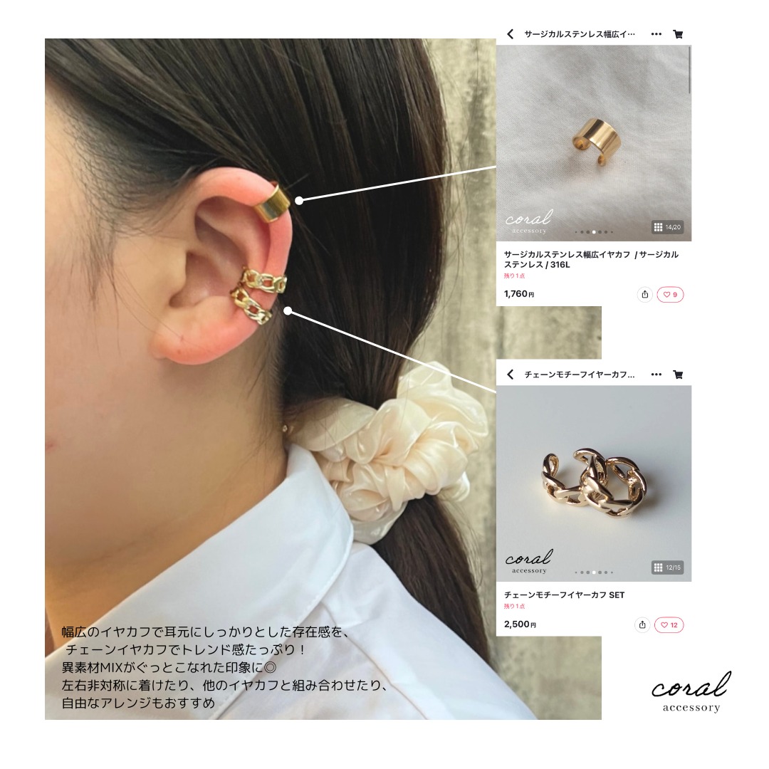 トレンド感たっぷりのチェーンモチーフイヤカフを重ねたスタイリング。